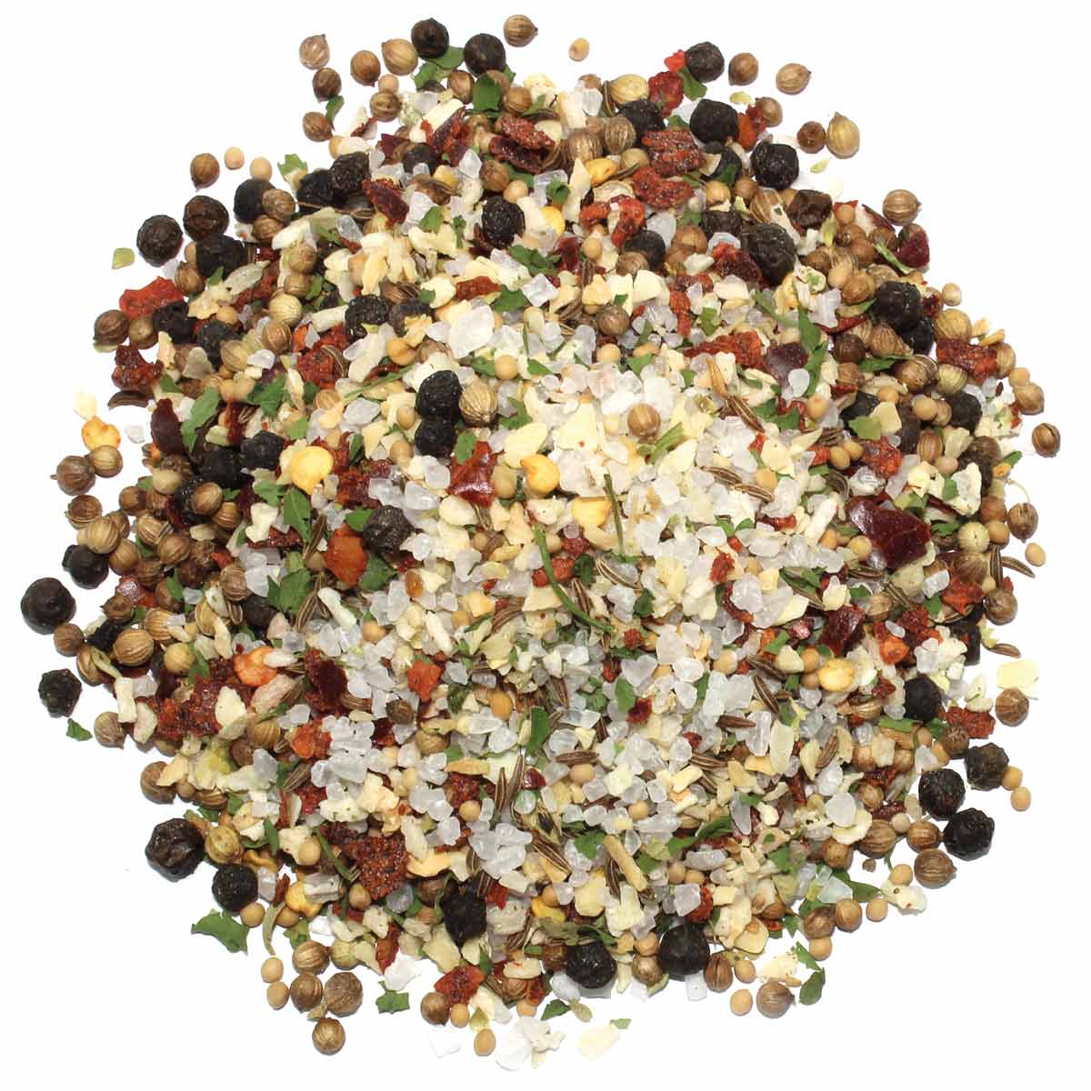 Zutaten: Meersalz (50%), Pfeffer, SENF, Knoblauch, Chili, Koriander, Zwiebel, Kümmel, Oregano, Petersilie