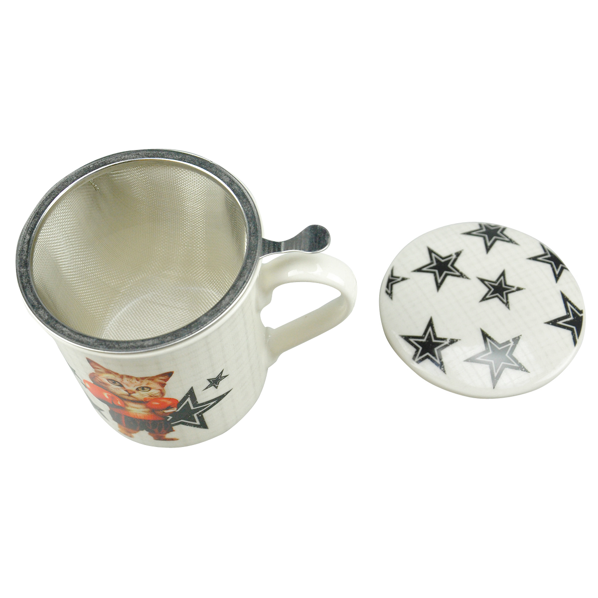 Kräuterteetasse m. Metallsieb & Deckel in Schmuckkarton Design Boxerkatze