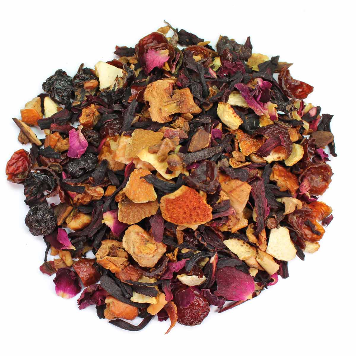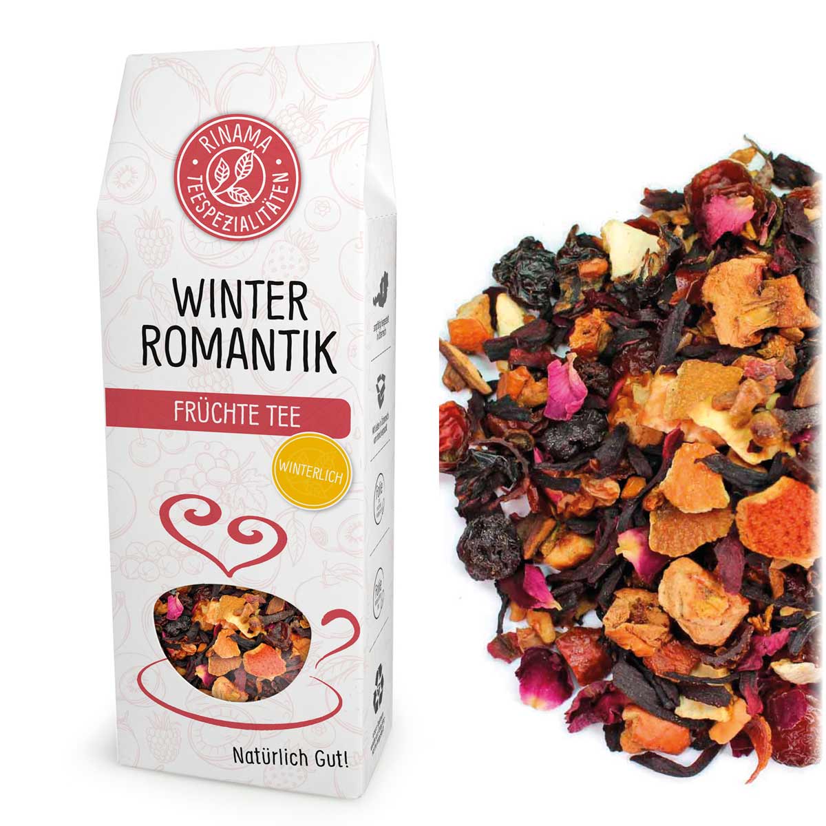 Diese Früchteteemischung mit Früchten und Gewürzen lässt keine Wünsche offen. Der Geschmack nach Äpfeln, Weinbeeren und Hagebutten lädt zum Träumen vor dem Kamin nach einem Winterspaziergang ein. Für besonders romantische Momente sorgen die bezaubernden Rosenblüten. Sie machen die Teemischung noch unwiderstehlicher. Einen gelungenen Ausklang eines kalten Wintertages verheißt diese Winter Romantik.