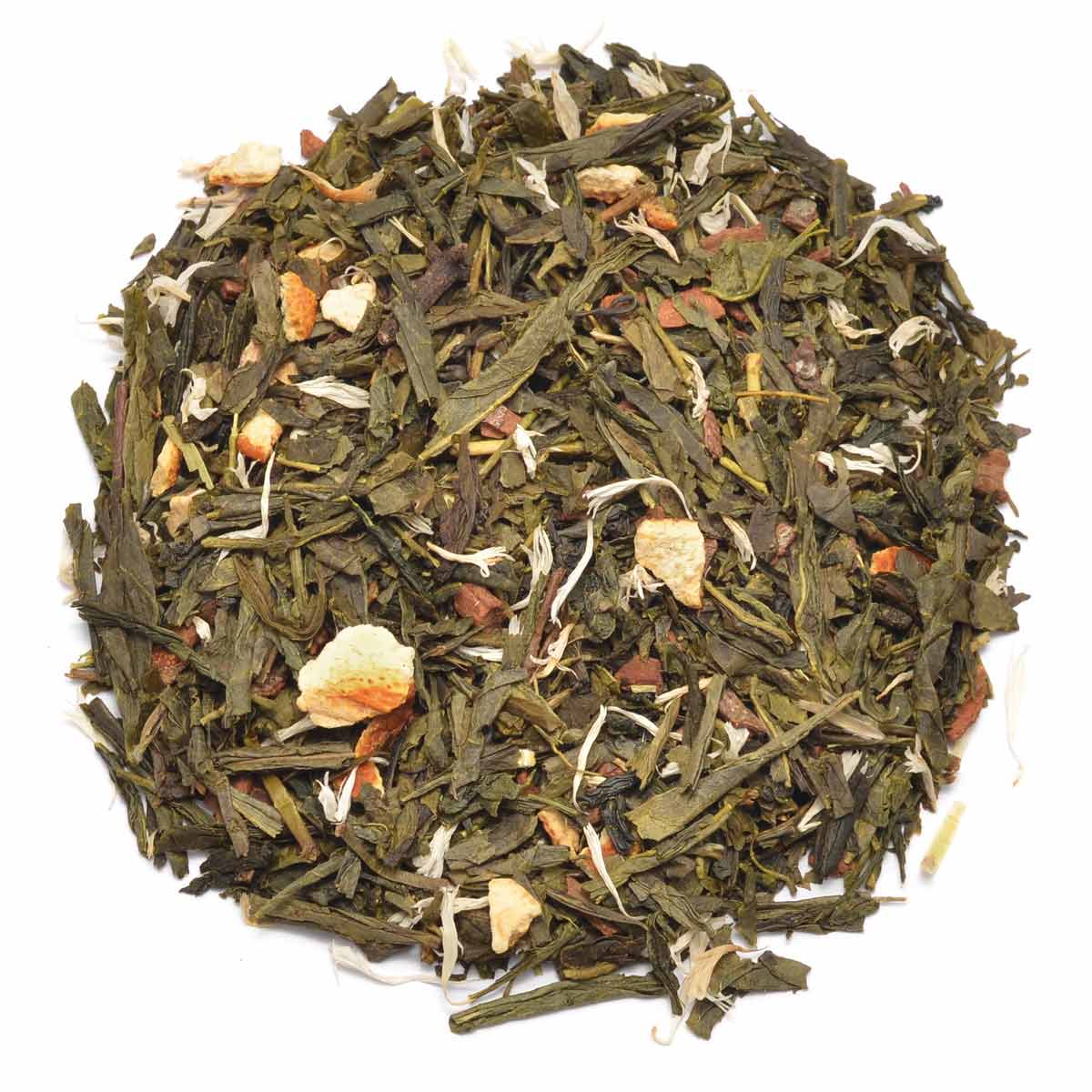 Zutaten: Grüner Tee Sencha (70%), Orangenschalen, Zimt, Nelken, Kornblumen weiß, natürliches Aroma